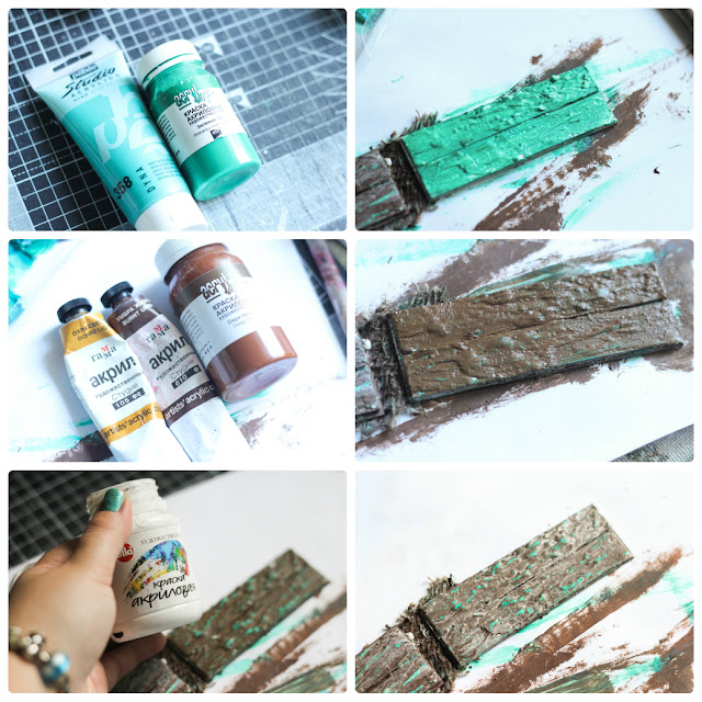 Бирюзовый+зеленый акрил - сушим. Натираем свечкой. Покрываем слоем коричневого акрила, сушим. Наждачкой, пилкой, ногтем, снимаем воск)) и сверху сухой кистью с белым акрилом втираем в наши деревяшки. Готово!